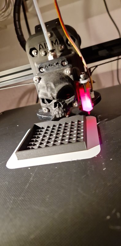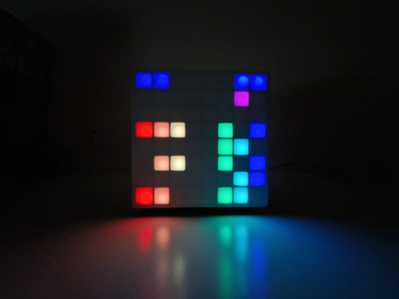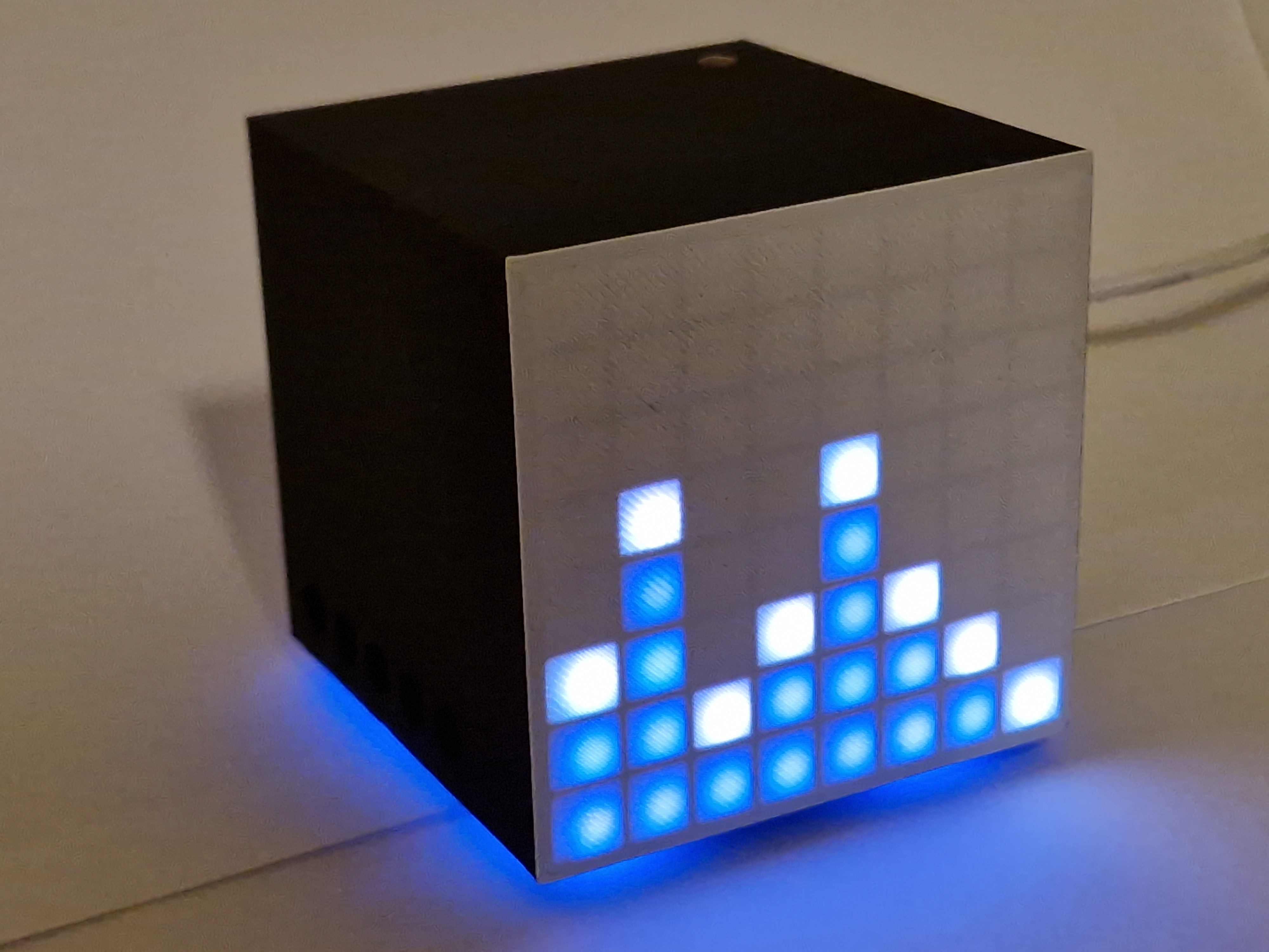 This project went through countless iterations. The first versions were just some blue LEDs on a breadboard. Over time, it became an LED matrix in a wooden box, with holes drilled into it. Now there are 64 individually addressable LEDs in a perfect matrix inside a custom 3D‑printed multimaterial case, providing clean looks and great diffusion of the lights (without light bleeding into neighboring boxes).